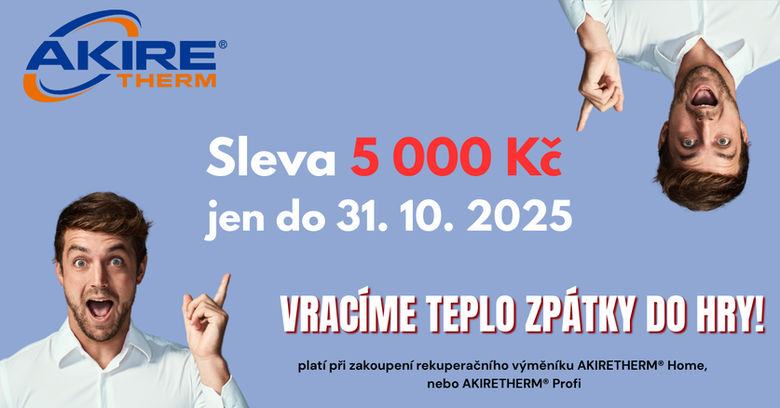 A pokud si zakoupíte AKIRETHERM® Home, nebo Profi do 31.10.2025, dostanete slevu 5 000 korun! To už není sleva jako na máslo v akci - tahle úspora vám přinese ještě něco navíc: dlouhodobé snížení nákladů na energie.
