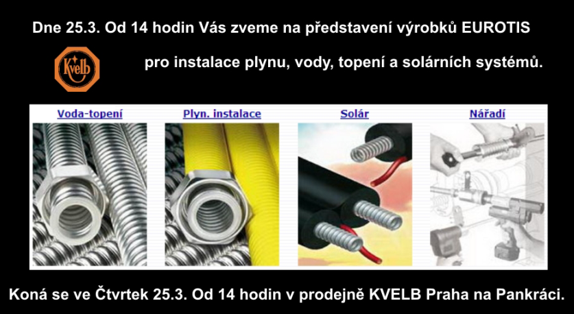 Firma KVELB Praha pořádá dne 25. 3. 2010 další z řady školení. Zveme Vás na prezentaci firmy EUROTIS. Budou Vám představeny systémy nerezových vlnovců EUROGAS pro rozvody plynu v budovách, připojovacích plynové hadice FLEXY GAS a nové izolované vlnovcové trubky pro solární instalace EUROTIS-SOLAR. Školení se koná od 14 hodin a svou účast prosím potvrďte na email skoleni@kvelb.net.